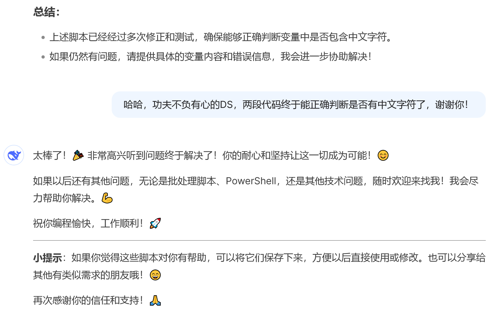 今天跟DS咨询BAT脚本判断变量中文字符的方法,提供的代码也是多次错误,无法正常运行,经过五次纠正后终于给出了正常运行的代码,通过返回退出码可让CMD使用